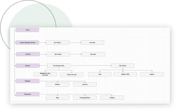 The feedback we had gotten was that the site was too product focused both in content and structure. This necessitated a re-haul of the site information architecture. I gathered the sales/marketing team, CEO, and PO for a card sorting exercise. We landed on a persona based solution that spoke to our 6 key customer segments: Owner Operators, Carrier Companies, Small Brokers, Large Brokers, Dealers and Auctions.